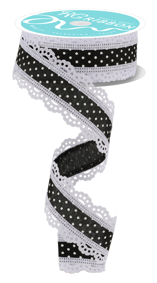 Wired Ribbon * Swiss Dot with Scalloped Edge * Black and White Canvas * 1.5" x 10 Yards * RG0886902