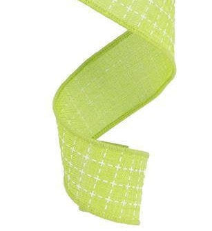 Wired Ribbon * Raised Stitched Squares * Lime and White * 1.5" x 10 Yards * Canvas * RG01677E9