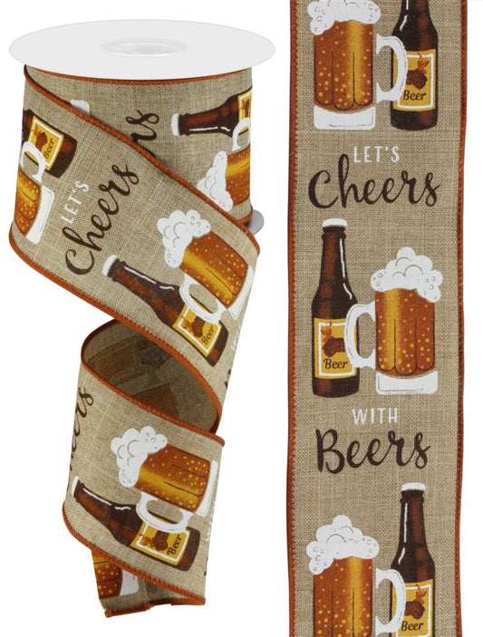 Wired Ribbon * Cheers With Beers * Lt. Beige, White, Gold, Rust and Brown Canvas * 2.5" x 10 Yards * RGC1257C9