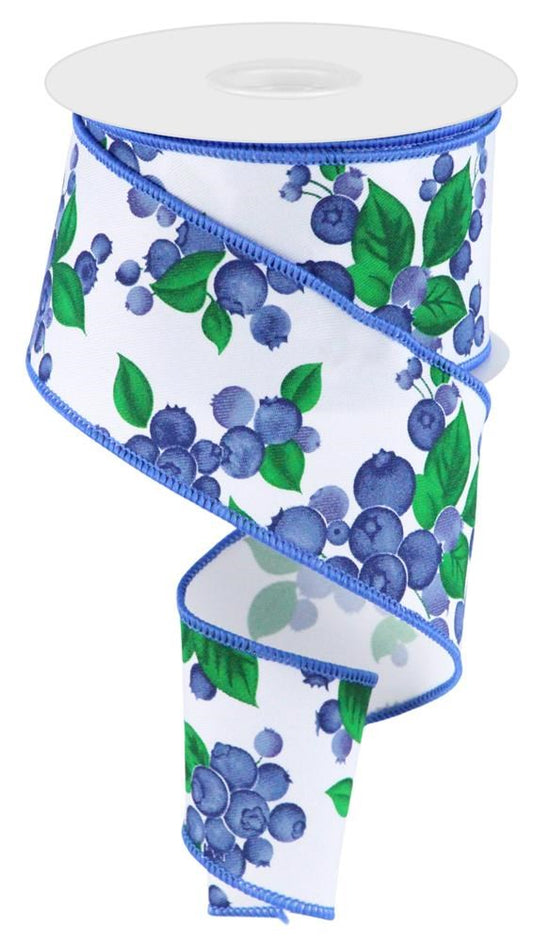 Wired Ribbon * Blueberries * White, Blue and Green Canvas * 2.5" x 10 Yards * RGC175327