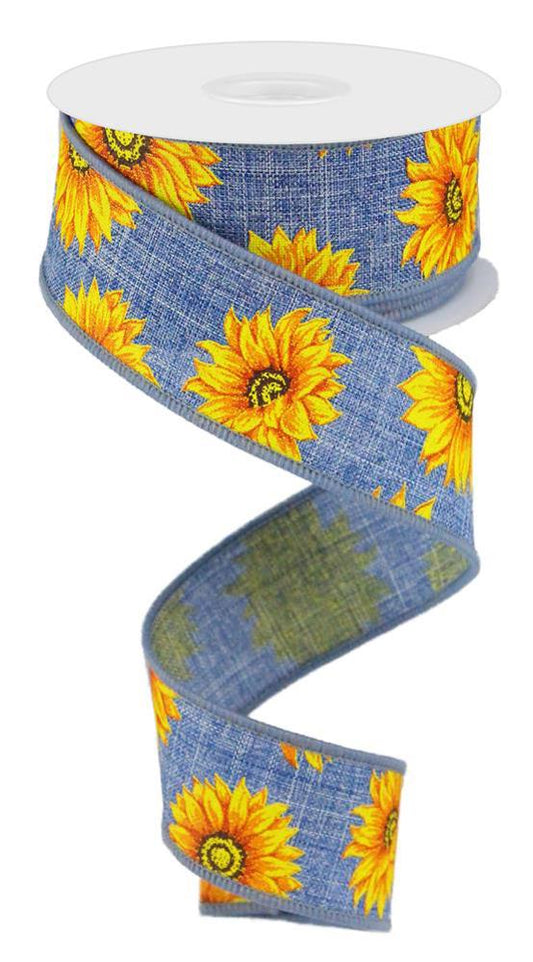 Wired Ribbon * Multi Sunflowers on Denim * Blue, Yellow, Orange, Rust and Brown * 1.5" x 10 Yards * RG01872CT