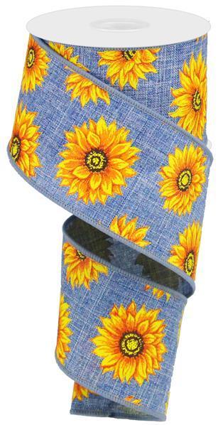 Wired Ribbon * Multi Sunflowers on Denim * Blue, Yellow, Orange, Rust and Brown * 2.5" x 10 Yards * RG01873CT