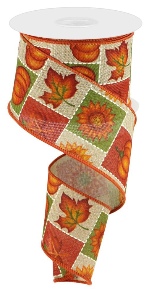 Wired Ribbon * Pumpkins, Sunflowers and Maple Leaves * Beige, Moss Green, Orange, Rust and Brown * 2.5" x 10 Yards * RGC140101