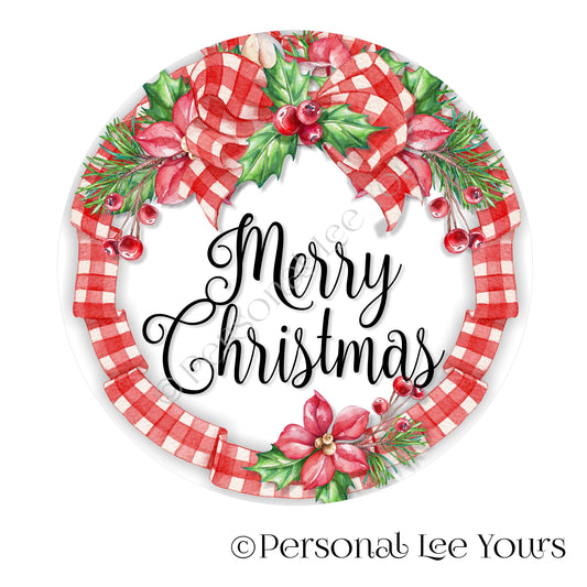 Holiday Wreath Sign * Red Gingham Bow * Merry Christmas * Round * Lightweight Metal