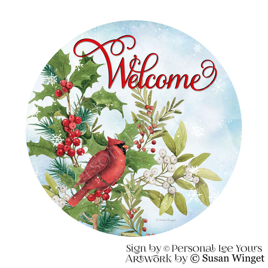 Susan Winget Exclusive Sign * Welcome Winter Hollyberry Cardinal * Round * Lightweight Metal