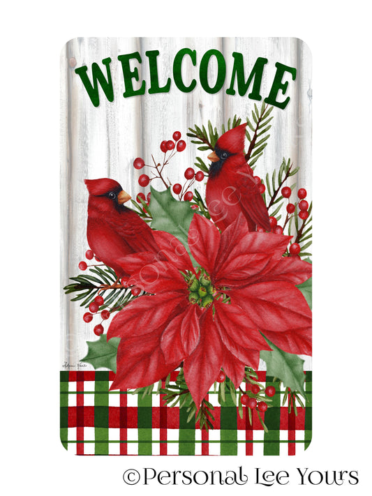 Christmas Wreath Sign * Welcome ~ Cardinals and Poinsettia * Vertical * 3 Sizes * Lightweight Metal