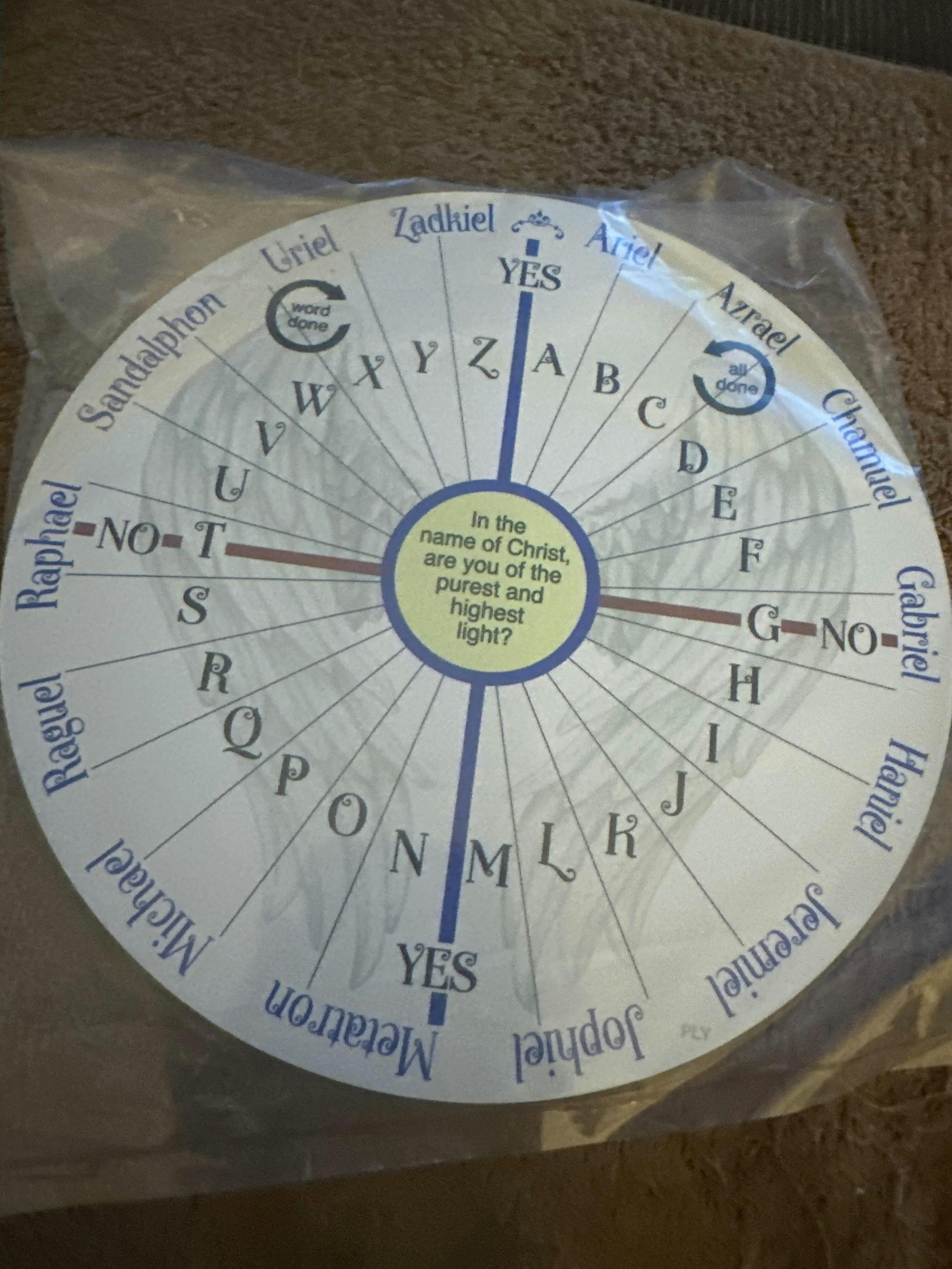 Center reads: In the name of Christ are you from the highest and purest light? (ask 3 times and you are always told the truth.)