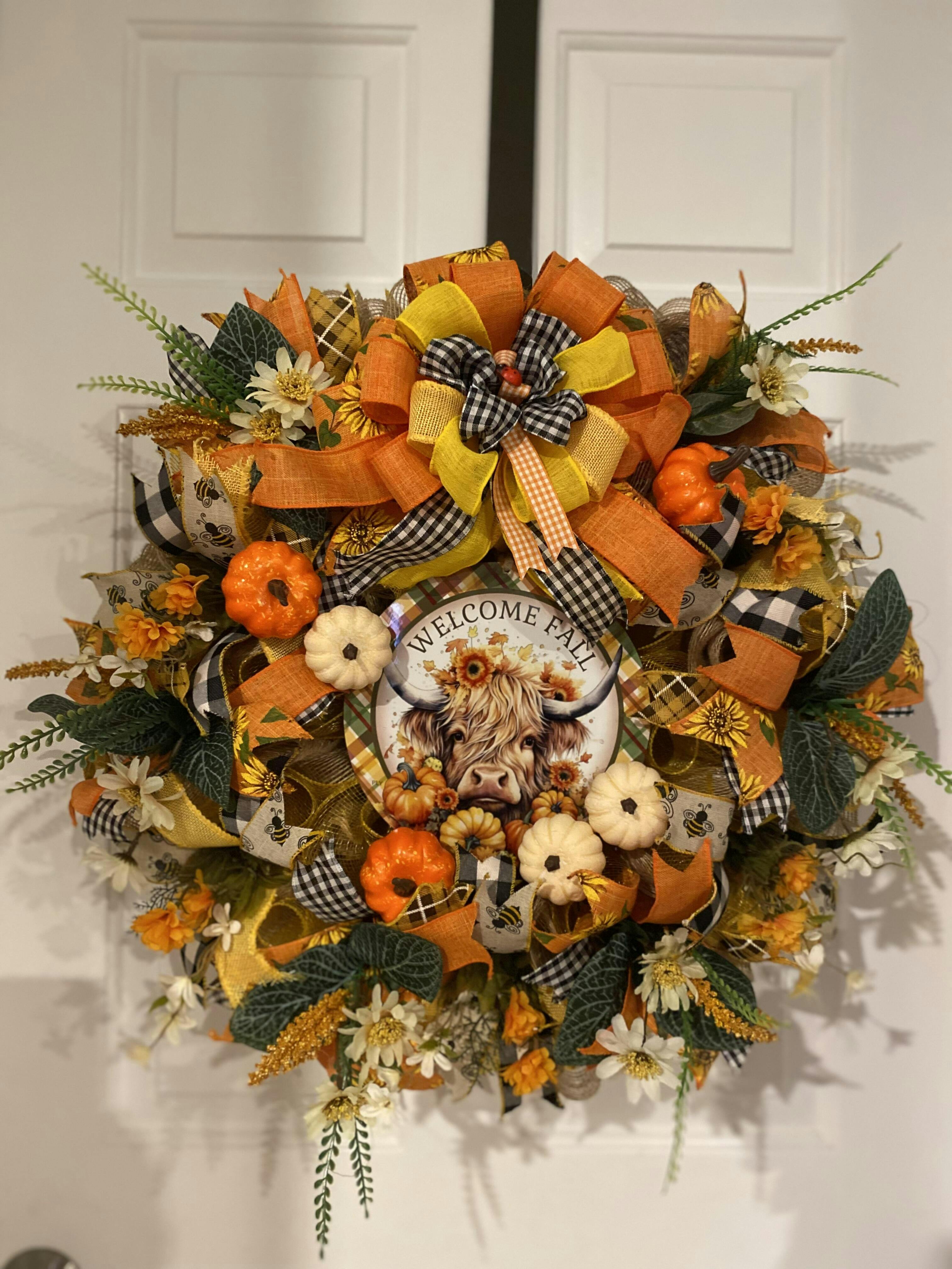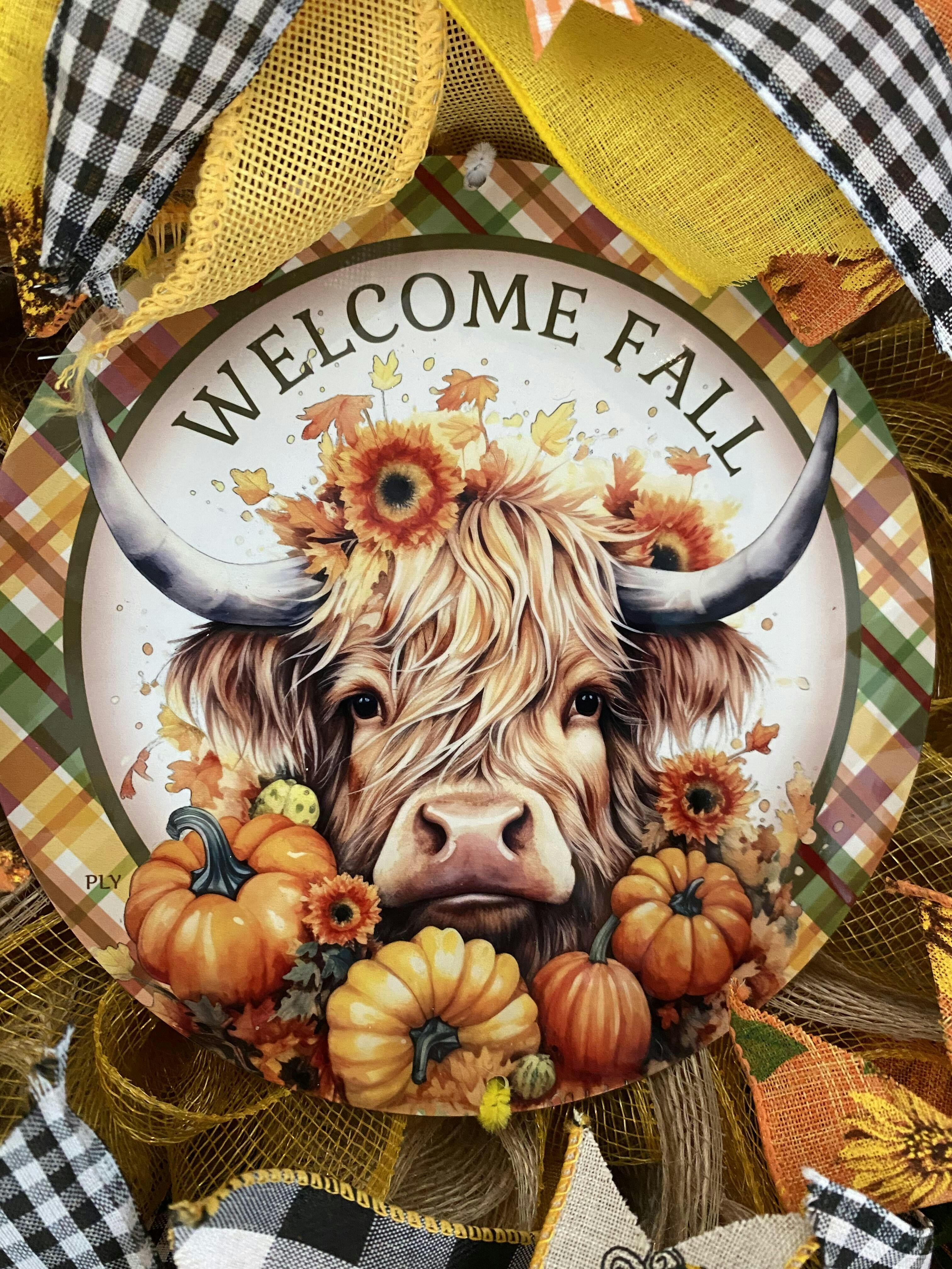 Autumn Wreath Sign * Welcome Fall Highland Cow * Round * Lightweight Metal