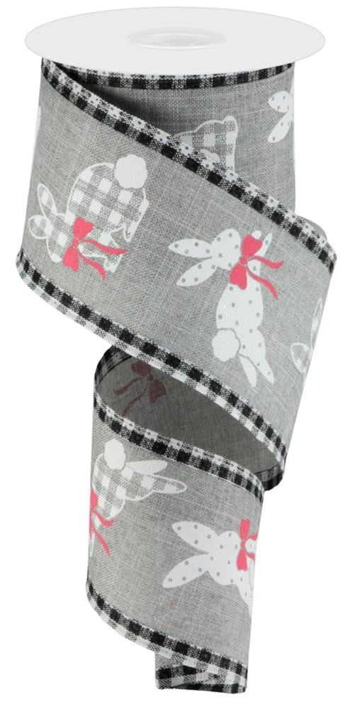 Easter Wired Ribbon * Bunnies * Gingham Trim * Grey, White, Pink and Black Canvas * 2.5" x 10 Yards * RG0879410