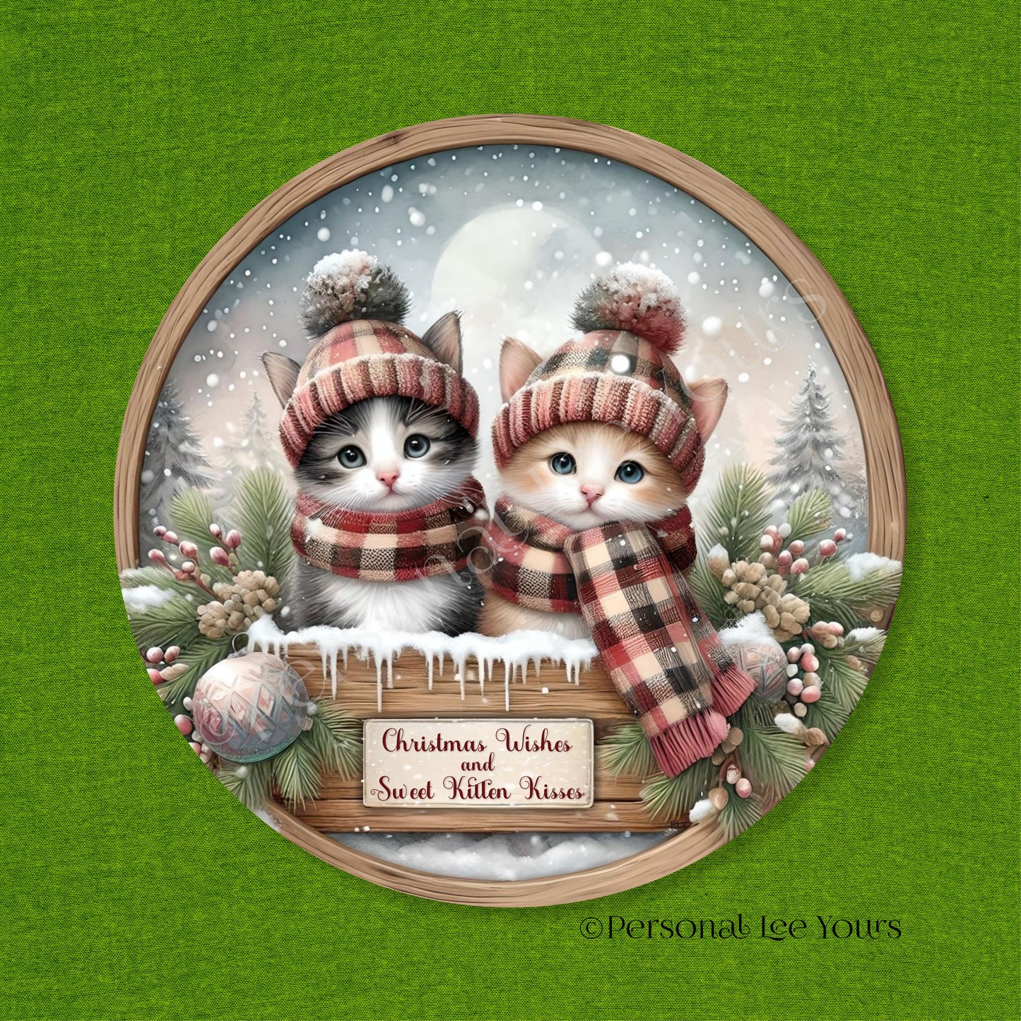 Holiday Wreath Sign * Christmas Wishes and Sweet Kitten Kisses * Round * Lightweight Metal