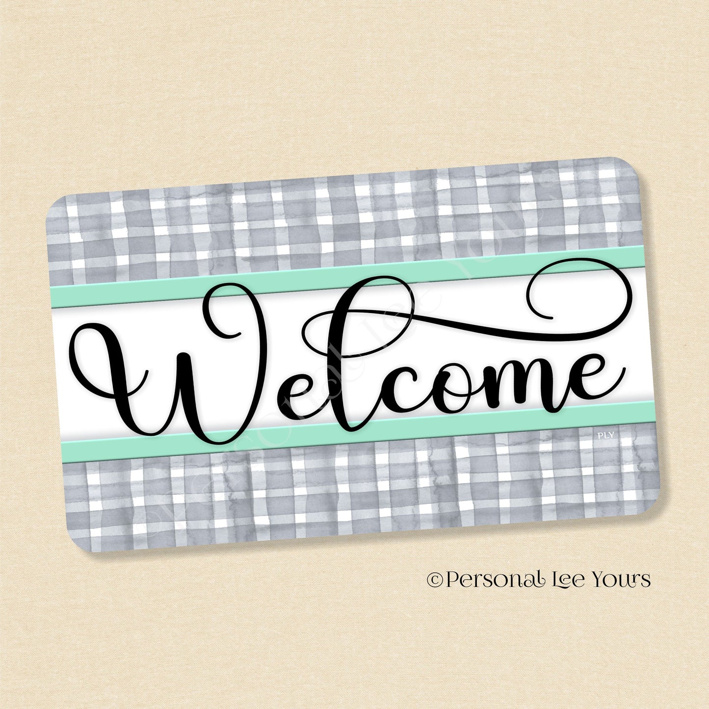 Simple Welcome Wreath Sign * Gingham Welcome * Grey/Mint * Horizontal * Lightweight Metal