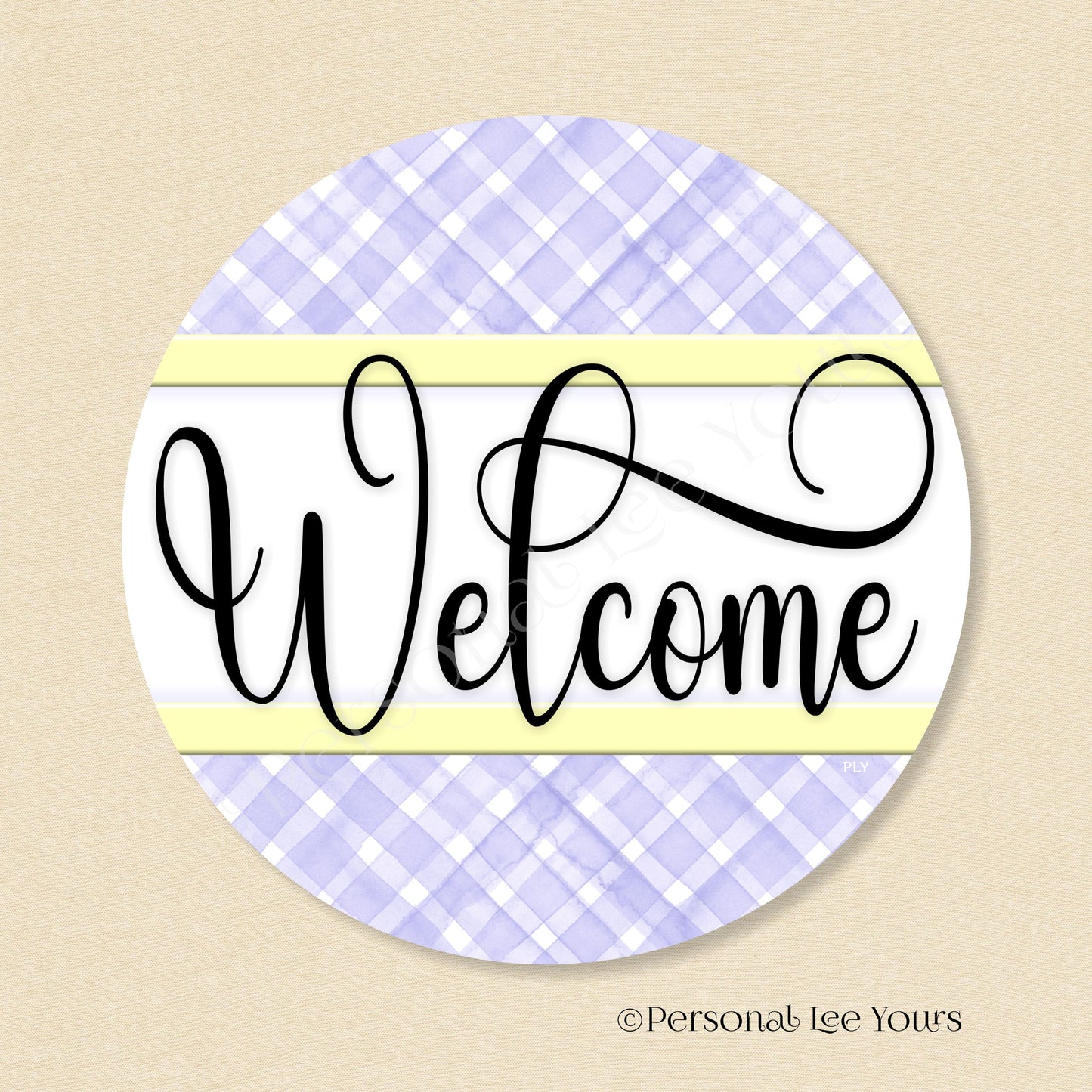 Simple Welcome Wreath Sign * Gingham Welcome * Lavender/Pale Yellow * Round * Lightweight Metal