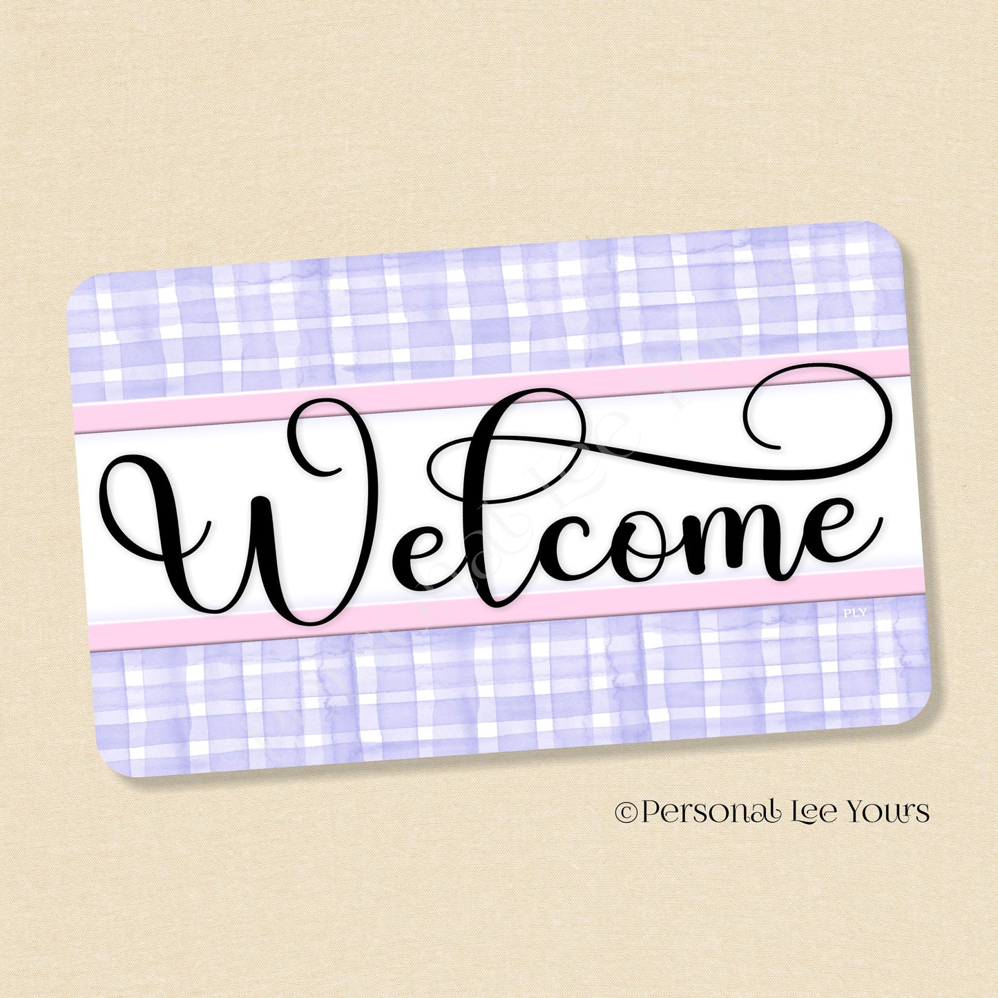 Simple Welcome Wreath Sign * Gingham Welcome * Lavender/Soft Pink * Horizontal * Lightweight Metal