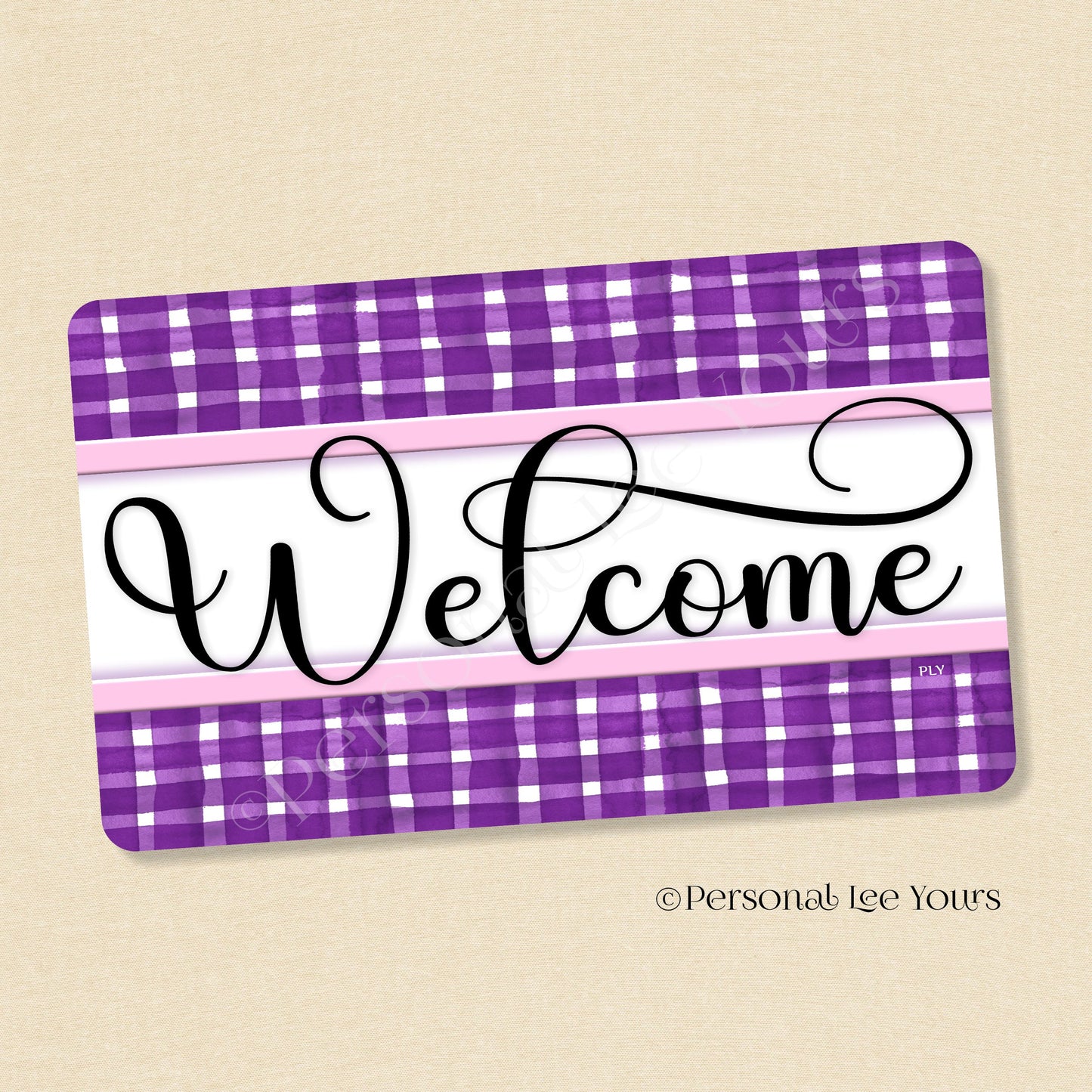 Simple Welcome Wreath Sign * Gingham Welcome * Purple/Pink * Horizontal * Lightweight Metal