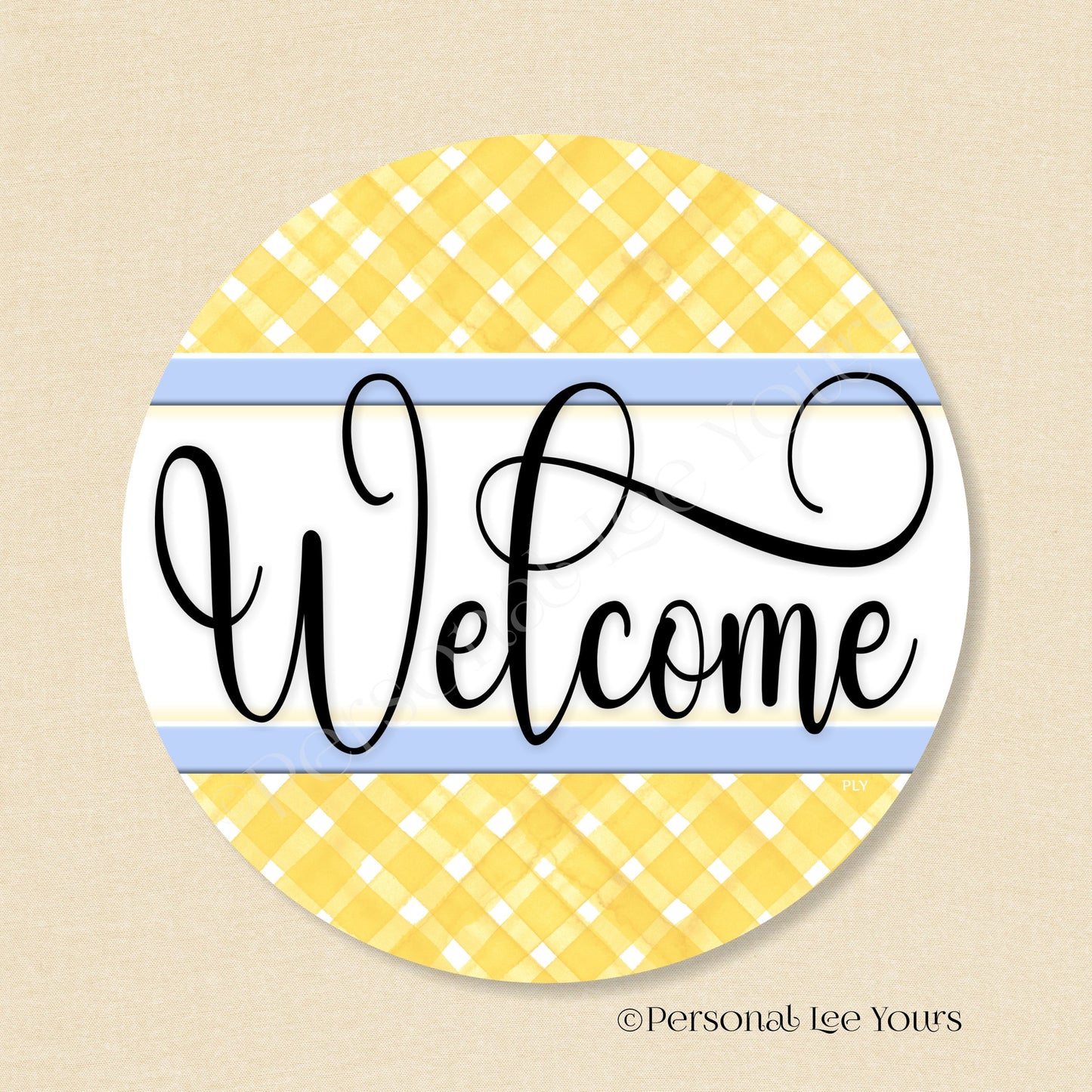 Simple Welcome Wreath Sign * Gingham Welcome * Yellow/Lt. Blue * Round * Lightweight Metal