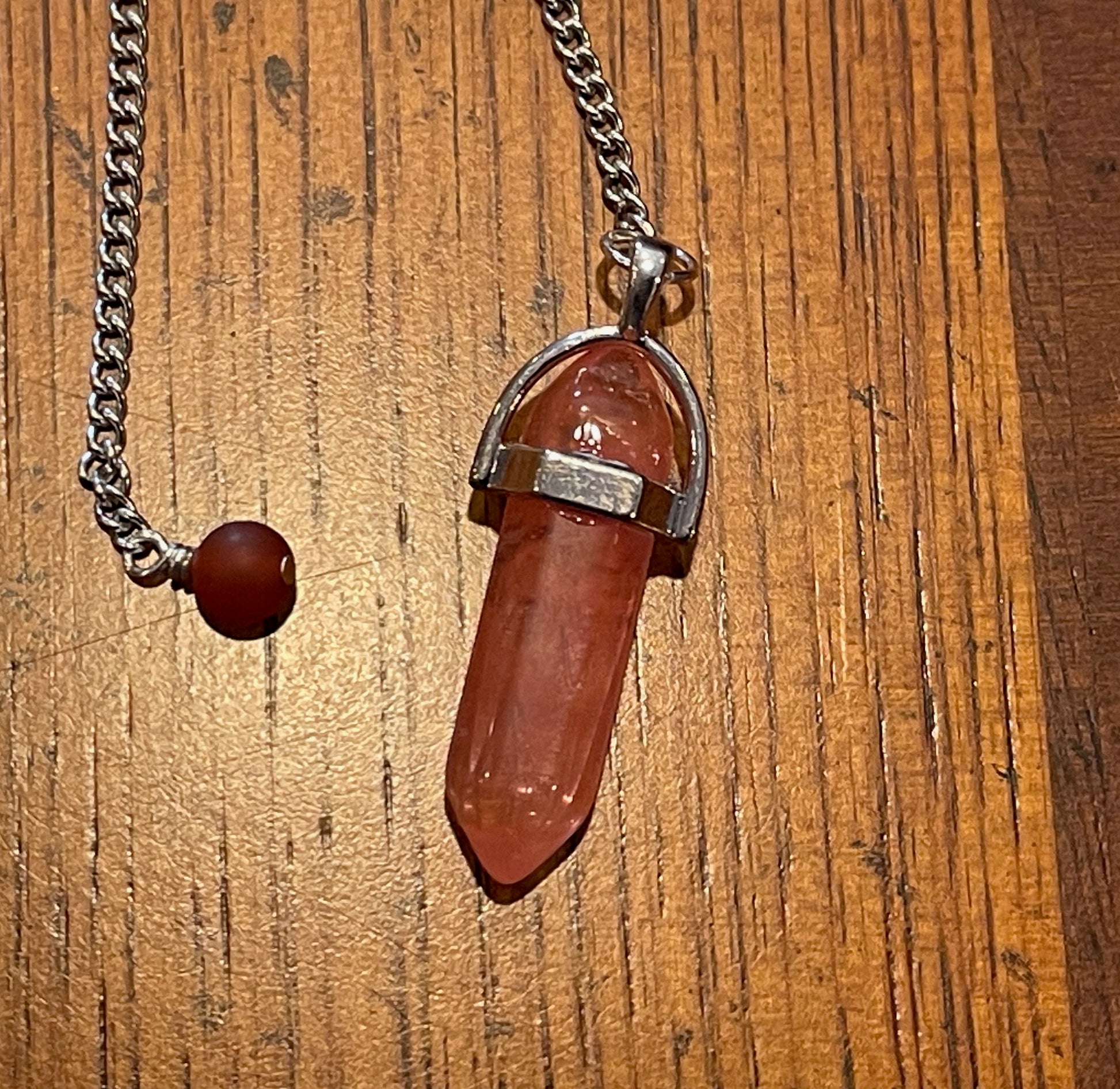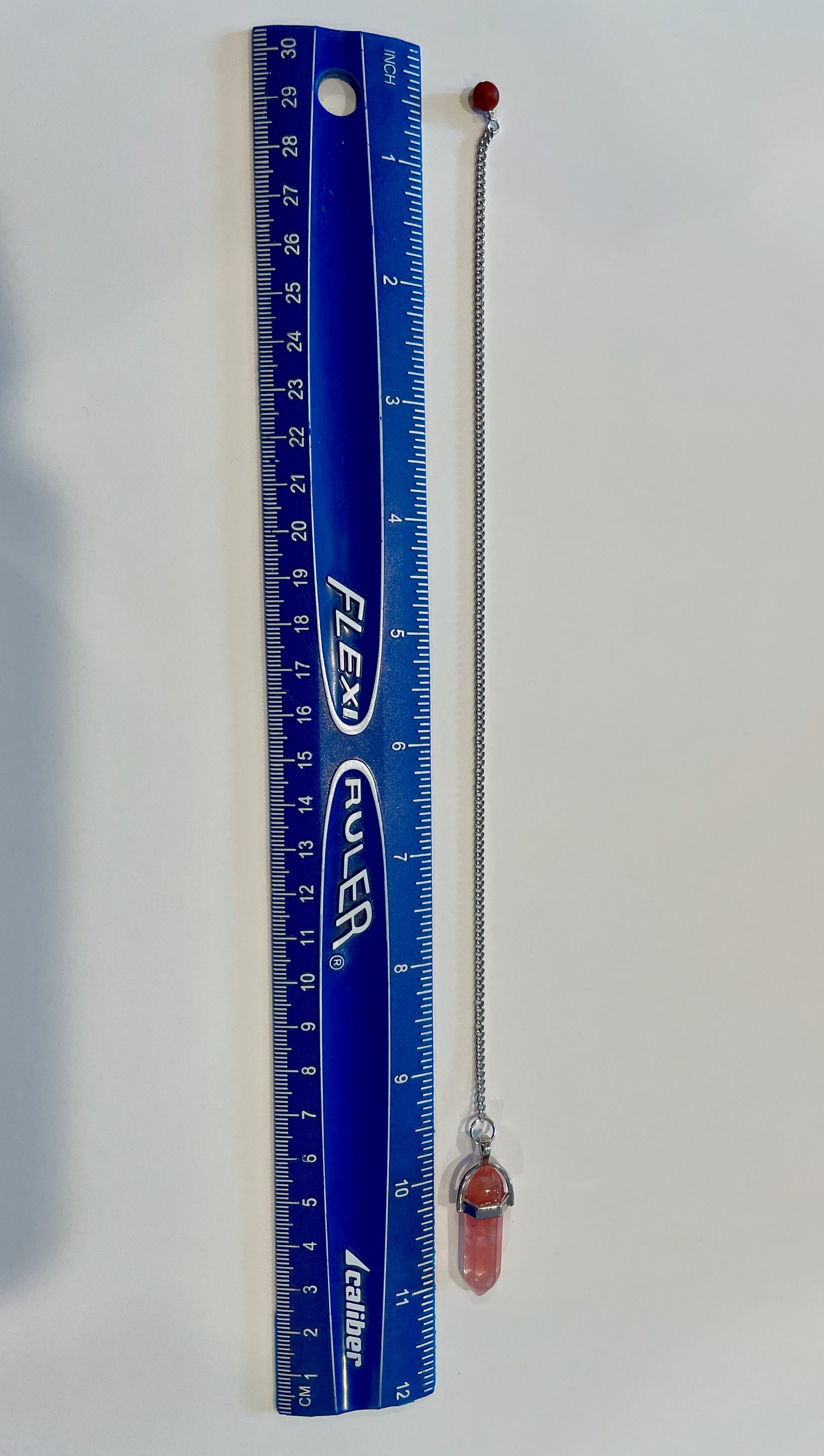 Strawberry Quartz Pendulum for use with pendulum board. This beautiful pendulum is made by one of our local artisans which means they are made in the United States.