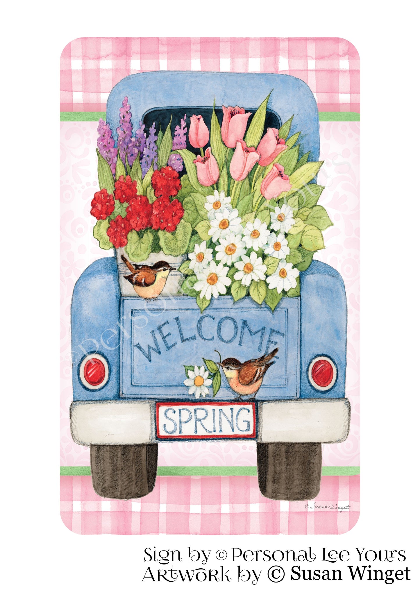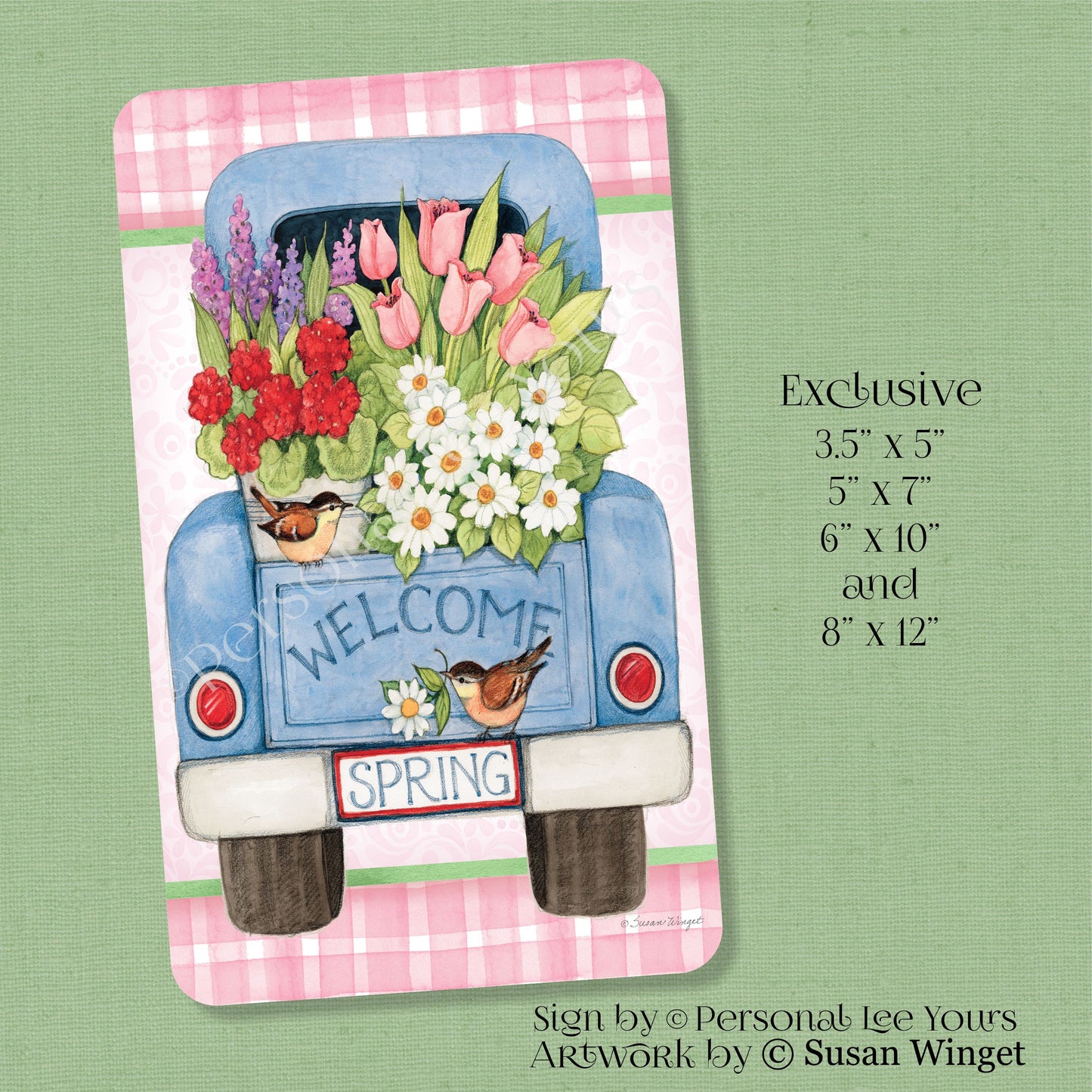 Susan Winget Exclusive Sign * Welcome Spring Blue Truck * Vertical * 4 Sizes * Lightweight Metal