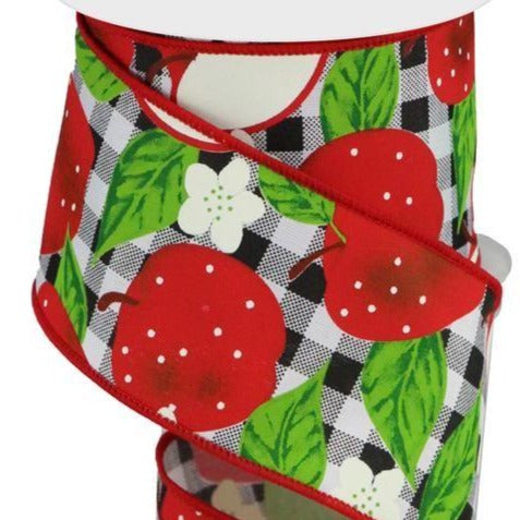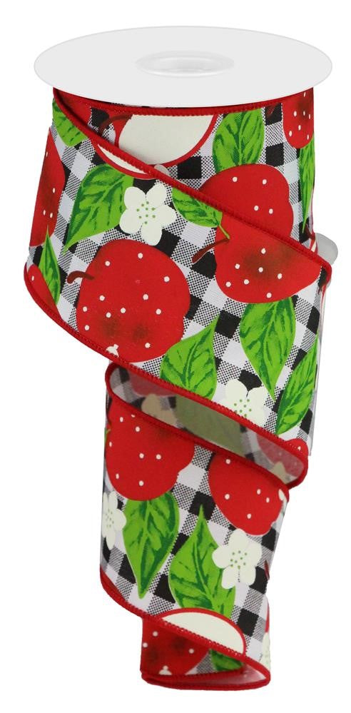 Wired Ribbon * Apples On Check * White, Red, Green & Black Canvas * 2.5" x 10 Yards * RGC1104X6