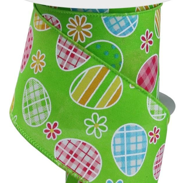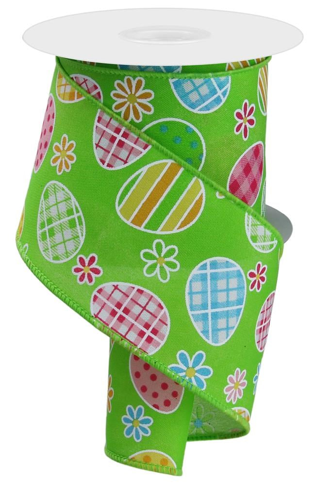 Wired Ribbon * Check Plaid Eggs With Daisies * Green, Blue, Lime, Pink, Gold and Yellow PG Canvas * 2.5" x 10 Yards * RGE1406A4