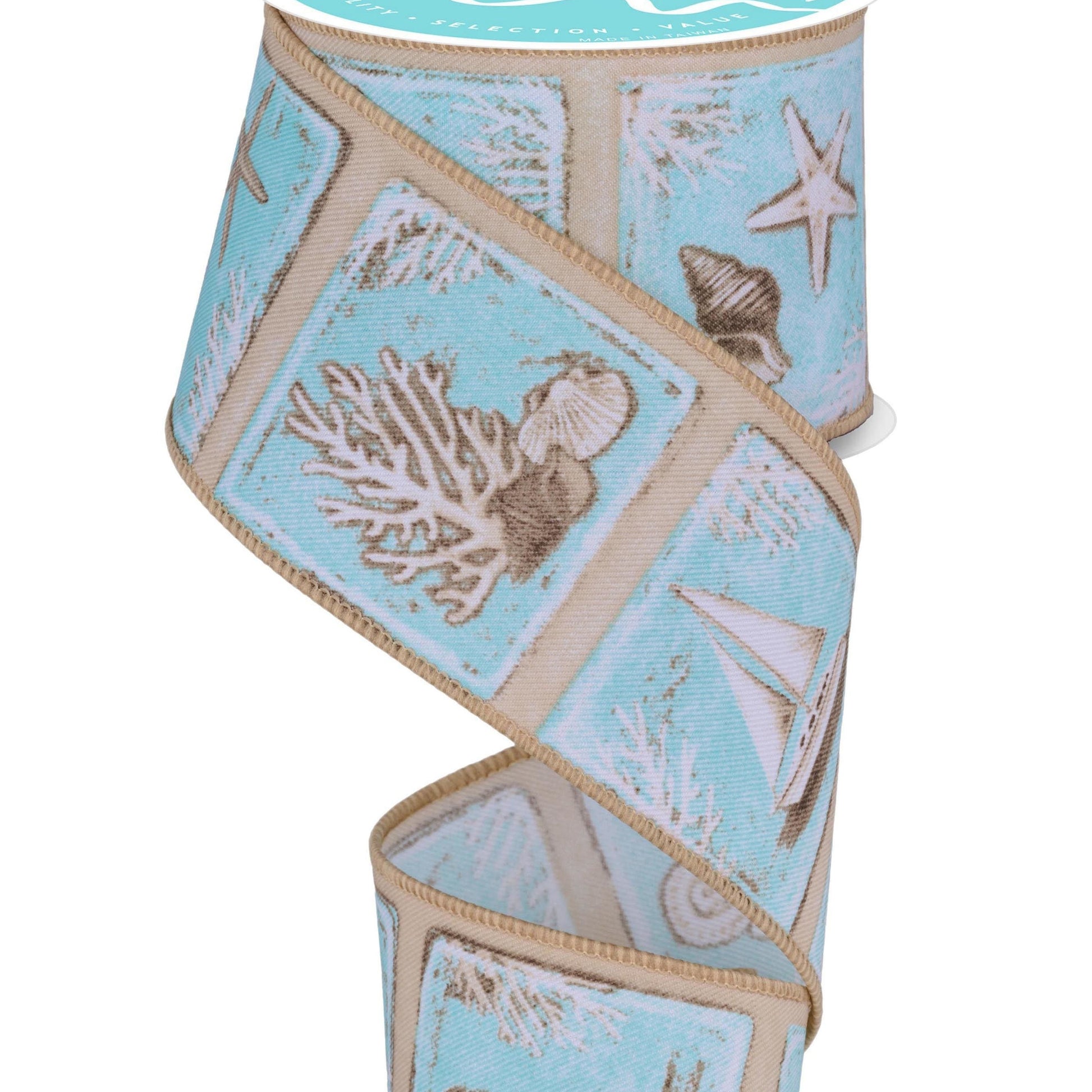 Wired Ribbon * Coastal Blocks * Beige, Mint, Brow and White * 2.5" x 10 Yards * Canvas * RGF14102Y