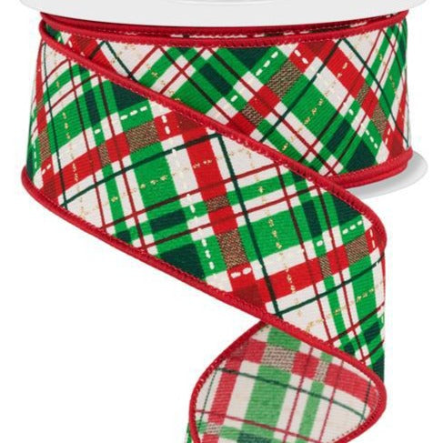 Wired Ribbon * Diagonal Bias Look Plaid * Ivory, Red. Green, Cream, Gold * 1.5" x 10 Yards * RGE179445 * Canvas