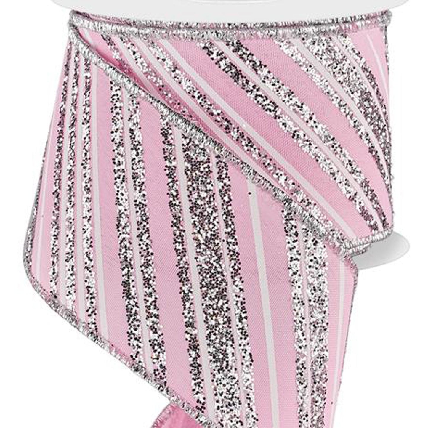 Wired Ribbon * Diagonal Lines * White, Pink and Silver 2.5" x 10 Yards Canvas * RGE185315