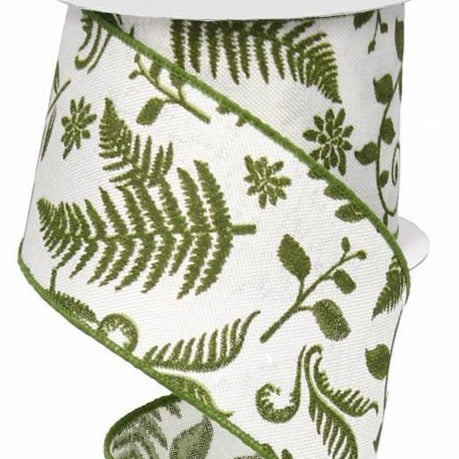 Wired Ribbon * Embroidered Greenery * Ivory and Green Canvas * 2.5" x 10 Yards * RG01309XT