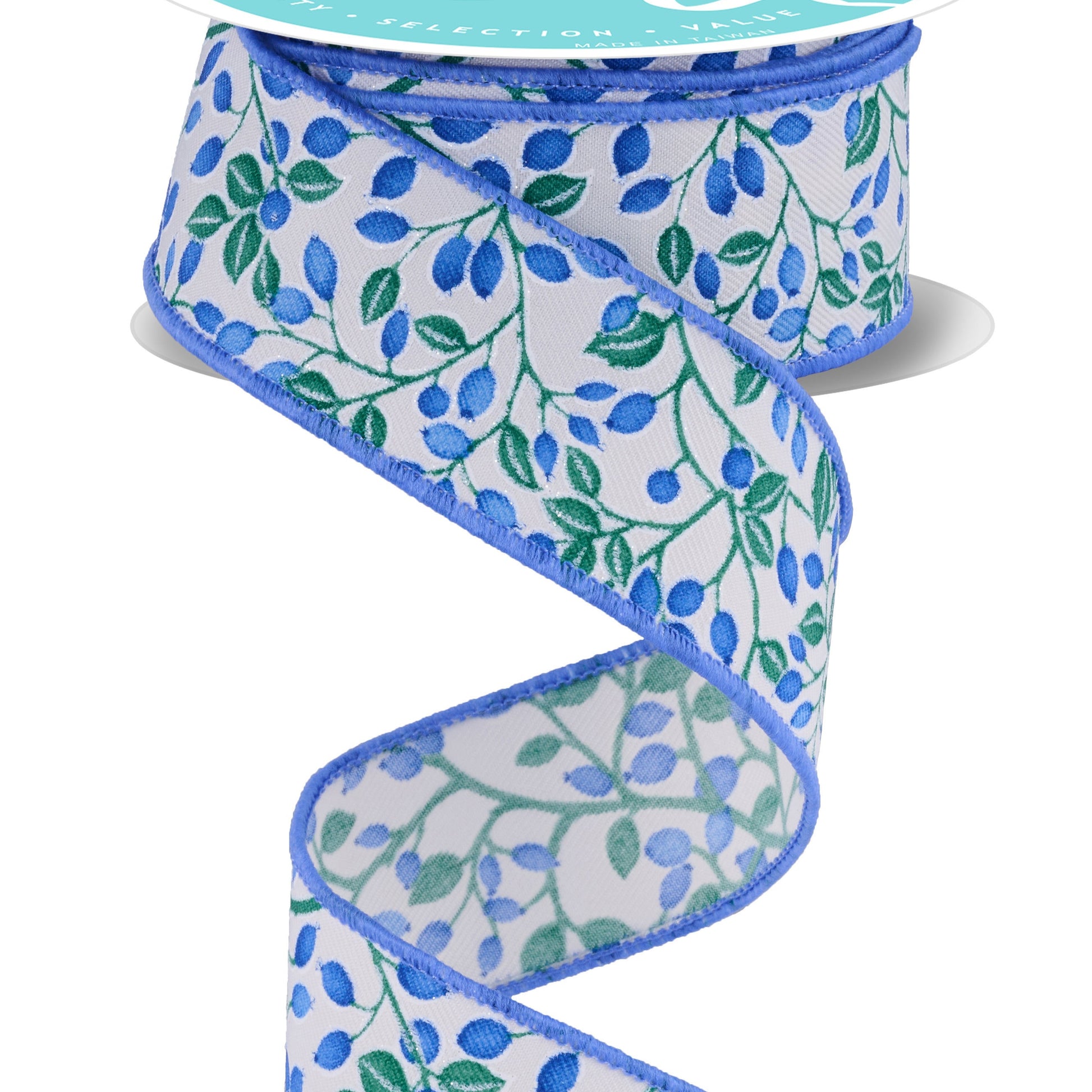 Wired Ribbon * Mini Berries On Vines * Ivory, White, Blue, Green * 1.5" x 10 Yards * RGF171330