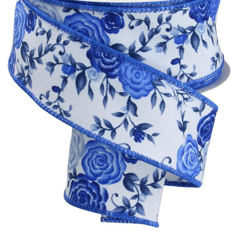 Wired Ribbon * Mini Roses * White and Multi Blue Canvas * 1.5" x 10 Yards * RGE1179RW