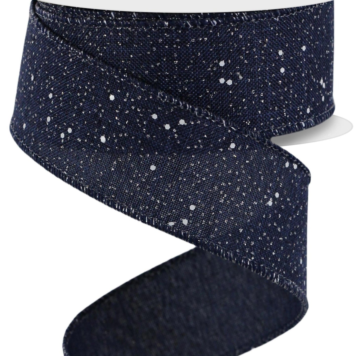 Wired Ribbon * Multi Snow Glitter * Navy and White Canvas * 1.5" x 10 Yards * RGC129119