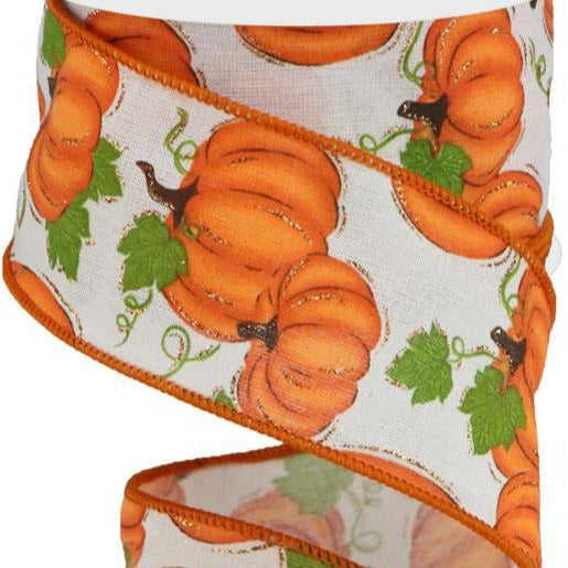 Wired Ribbon * Pumpkin Patch * Off White, Orange and Moss * 2.5" x 10 Yards Canvas * RGA147733