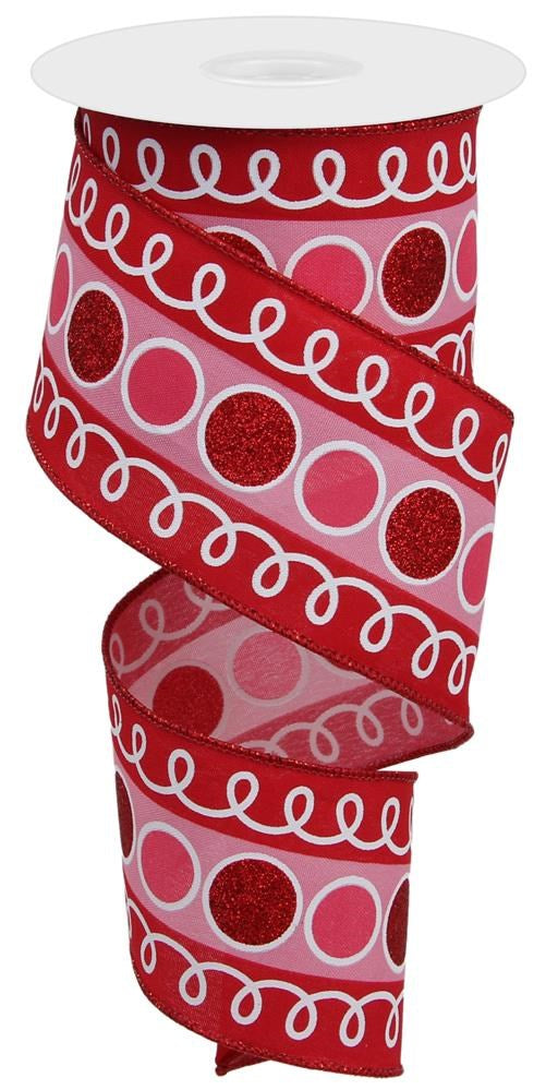 Wired Ribbon * Stripe Glitter Circles and Loops * Red, Pink and White * 2.5" x 10 Yards * RGE1068Y1