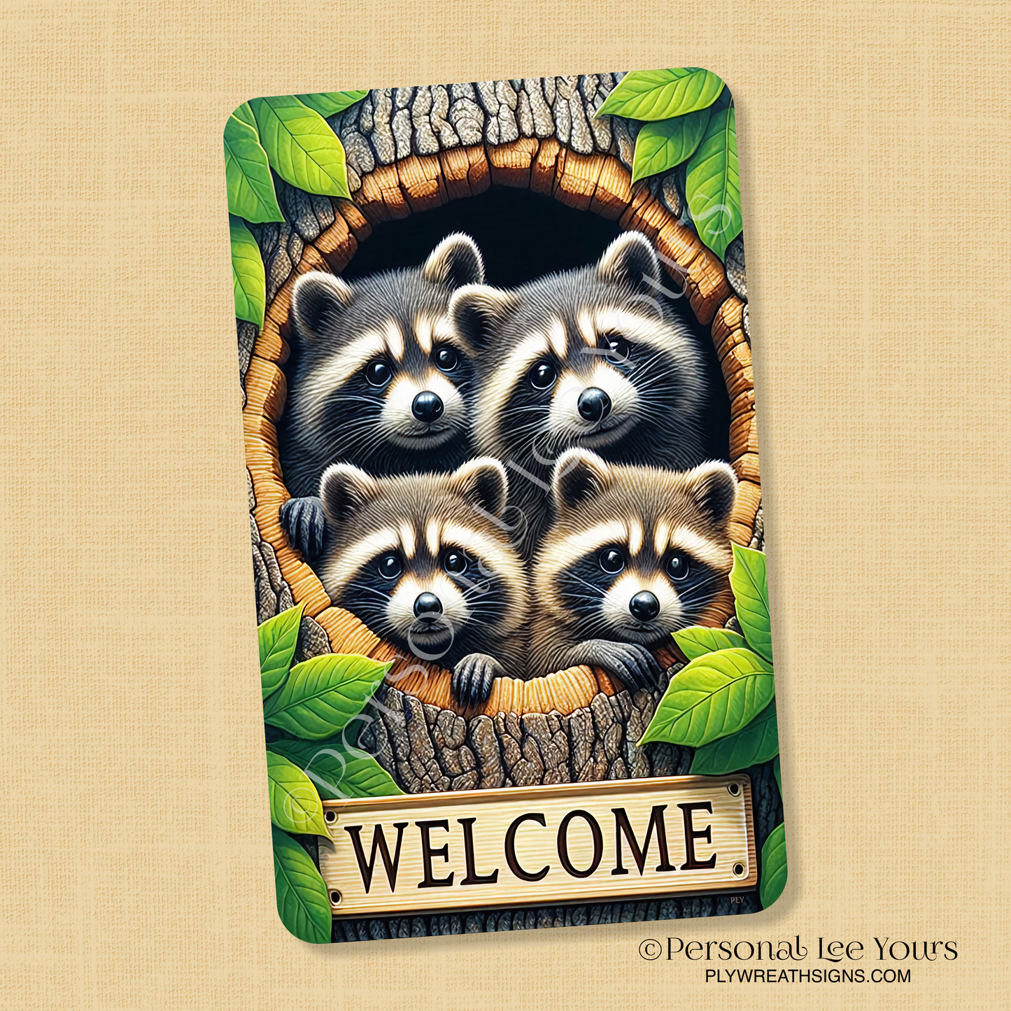 Wreath Sign * Raccoon Welcome * Vertical * 4 Sizes * Lightweight Metal